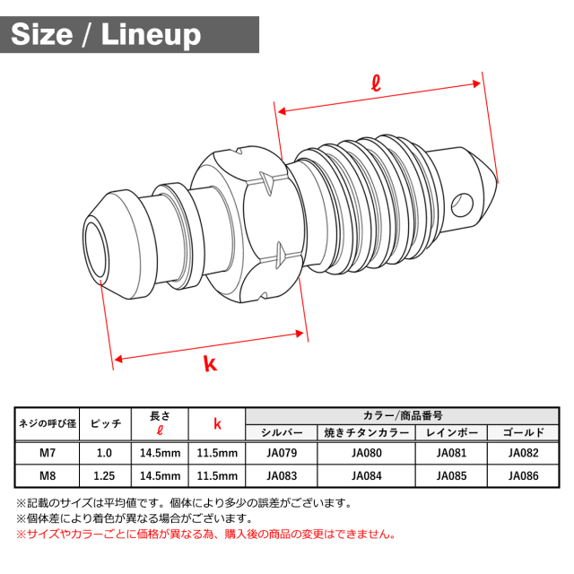 | 【ご注意】 ※ご購入前にネジ径とピッチを必ずご確認下さい。 ※キャップは付属していません。 |