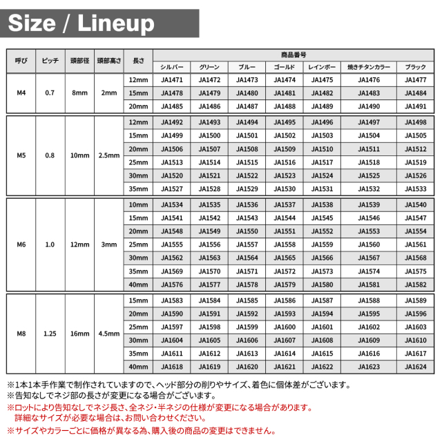 | 【ご注意】 ・サイズやカラーごとに価格が異なる為、購入後の商品の変更はできません。 ・告知なしでネジ部の長さが変更になる場合がございます。 ・製造ロット、長さにより全ネジ、半ネジが混在する可能性がございます。 ・1本1本手作業で制作されていますので、ヘッド部分の削りやサイズ、着色に個体差がございます。 |