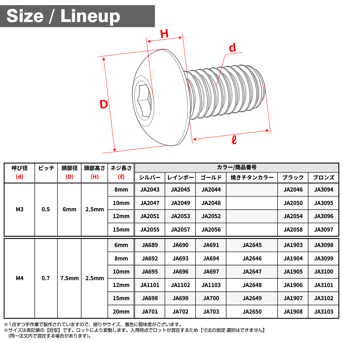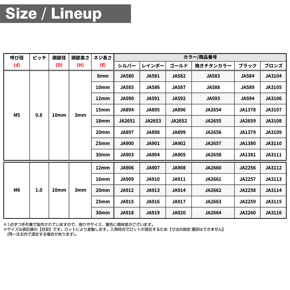 | 【ご注意】 ・サイズやカラーごとに価格が異なる為、購入後の商品の変更はできません。 ・告知なしでネジ部の長さが変更になる場合がございます。 ・製造ロット、長さにより全ネジ、半ネジが混在する可能性がございます。 ・1本1本手作業で制作されていますので、ヘッド部分の削りやサイズ、着色に個体差がございます。 |