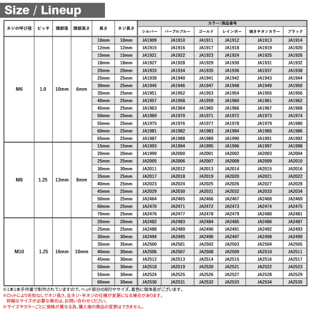| 【ご注意】 ・サイズやカラーごとに価格が異なる為、購入後の商品の変更はできません。 ・告知なしでネジ部の長さが変更になる場合がございます。 ・製造ロット、長さにより全ネジ、半ネジが混在する可能性がございます。 ・1本1本手作業で制作されていますので、ヘッド部分の削りやサイズ、着色に個体差がございます。 |
