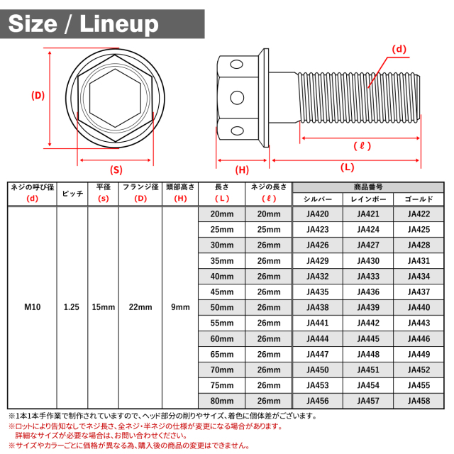 | 【ご注意】 ・サイズやカラーごとに価格が異なる為、購入後の商品の変更はできません。 ・告知なしでネジ部の長さが変更になる場合がございます。 ・製造ロット、長さにより全ネジ、半ネジが混在する可能性がございます。 ・1本1本手作業で制作されていますので、ヘッド部分の削りやサイズ、着色に個体差がございます。 |