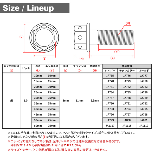 | 【ご注意】 ・サイズやカラーごとに価格が異なる為、購入後の商品の変更はできません。 ・告知なしでネジ部の長さが変更になる場合がございます。 ・製造ロット、長さにより全ネジ、半ネジが混在する可能性がございます。 ・1本1本手作業で制作されていますので、ヘッド部分の削りやサイズ、着色に個体差がございます。 |