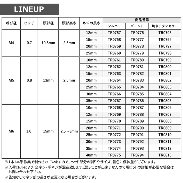 | 【ご注意】 ・サイズやカラーごとに価格が異なる為、購入後の商品の変更はできません。 ・告知なしでネジ部の長さが変更になる場合がございます。 ・製造ロット、長さにより全ネジ、半ネジが混在する可能性がございます。 ・1本1本手作業で制作されていますので、ヘッド部分の削りやサイズ、着色に個体差がございます。 |